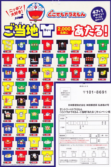 ドラえもん公式 ドラえもんチャンネル on twitter サントリー どこでもドラえもん ご当地tシャツ プレゼントキャンペーン実施中 http t co cd18sbhn5a 対象商品のバーコードを4枚1口で応募すると抽選で2 000名様にご当地tシャツが当たる 5 31消印有効