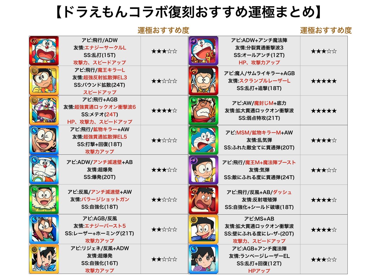 とんぬん on twitter ドラえもんコラボ復刻おすすめ運極まとめ 個人的に火のび太 木ジャイアンを推してます