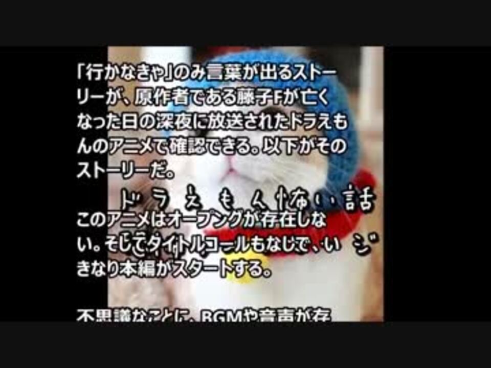 知ったら後悔するアニメの怖い話 twitter da 藤子fが亡くなった日の深夜 藤子fが亡くなった日の深夜に 突然 ドラえもん が放送された オープニングが流れた後 10分ほど歩くのび太の後ろ姿が流され 最後にのび太が 行かなきゃ と言ってフェードアウトした