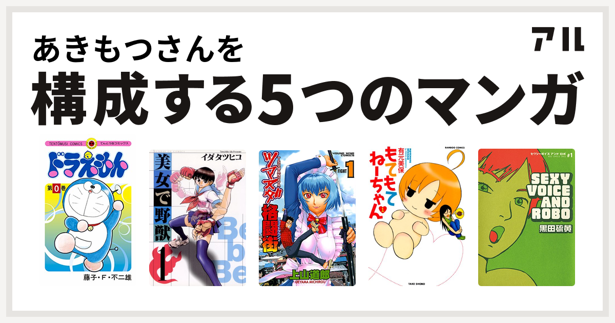 あきもつさんを構成するマンガはドラえもん 美女で野獣 ツマヌダ格闘街 もてもてねーちゃん セクシーボイス アンドロボ 私を構成する5つのマンガ アル