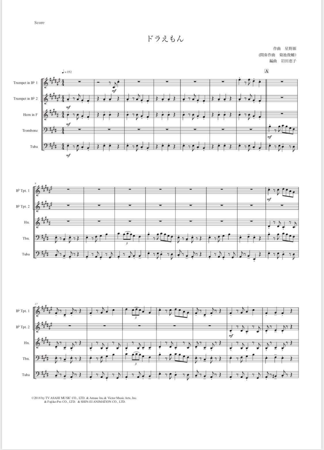 ドラえもんのうた 菊池俊輔 金管五重奏楽譜 はなおか音楽工房
