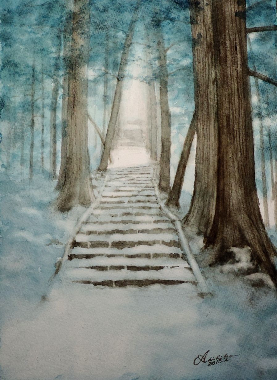 千年杉と雪の石段 水彩画工房 四季彩くらぶ